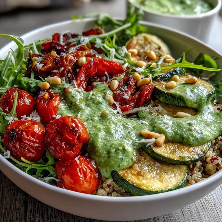 Save to Pinterest I stumbled onto this bowl on a Tuesday afternoon when my fridge was nearly empty except for a bunch of peppery arugula that was about to turn dark. Instead of tossing it, I threw it into a food processor with some walnuts and olive oil, and suddenly I had this vibrant green sauce that transformed everything it touched. That happy accident became the foundation for what's now one of my most-reached-for lunch bowls, especially when I need something that tastes like spring but takes less than an hour from start to finish.