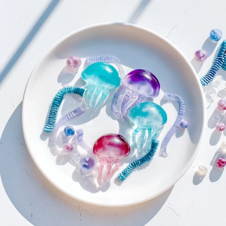 - Jellyfish Gummies: 1 cup fruit juice (e.g. apple, grape, or berry), 2 tbsp powdered gelatin (or vegetarian alternative like agar-agar), 3 tbsp granulated sugar, Food coloring (optional, blue, pink, purple), 1 tsp lemon juice