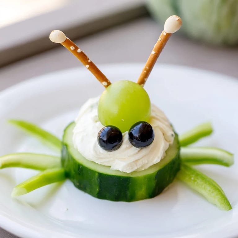 Slice cucumbers into rounds, spread cream cheese on top, then add grapes or sugar snap peas for heads. Use olives for mouths and eyes, and add pretzel sticks as antennae with olive or grape tips.