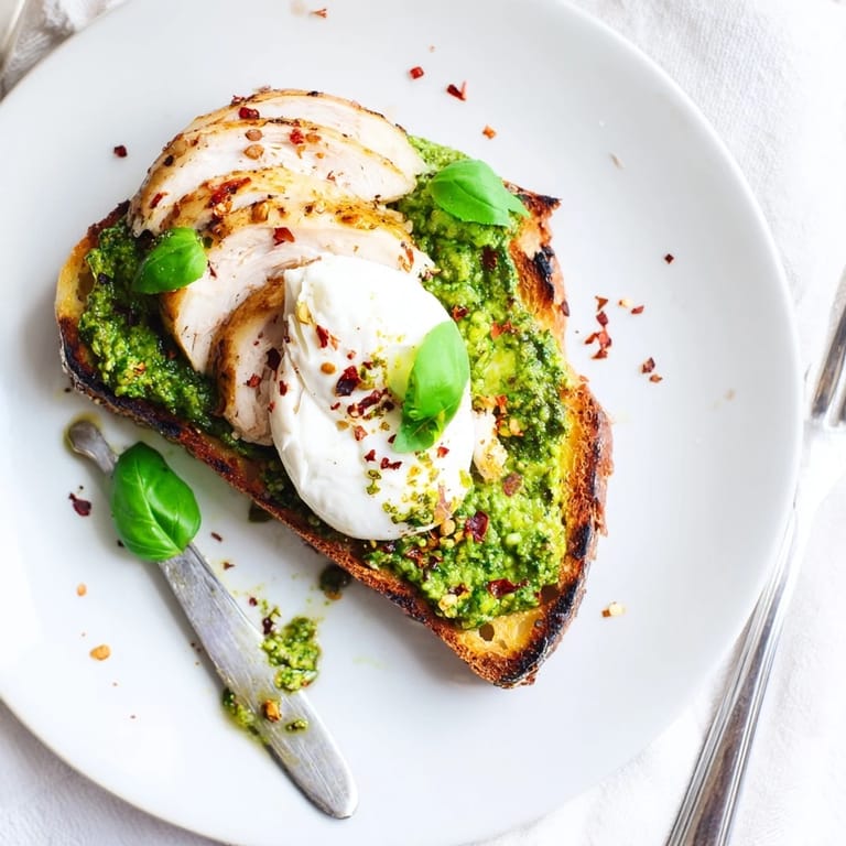 - Spread pesto generously over warm bread, arrange sliced chicken on top, then tear the burrata directly onto each toast so the cream puddles beautifully