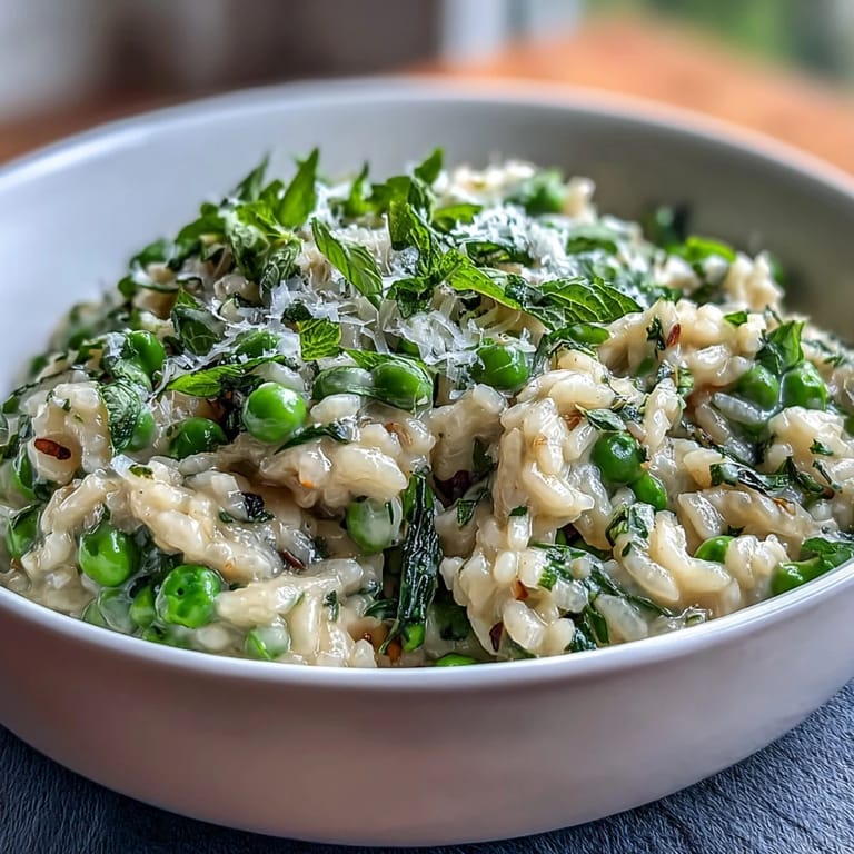 Save to Pinterest My neighbor knocked on the kitchen door one April afternoon with a basket of the first fresh peas from her garden, and suddenly I was standing there at the stove, stirring rice while spring light poured through the window. That single gesture—her generosity, the tender peas still warm from the earth—made me want to create something that honored both the ingredient and the moment. This risotto became my answer, a dish that captures that exact feeling of renewal you get when the seasons finally turn.